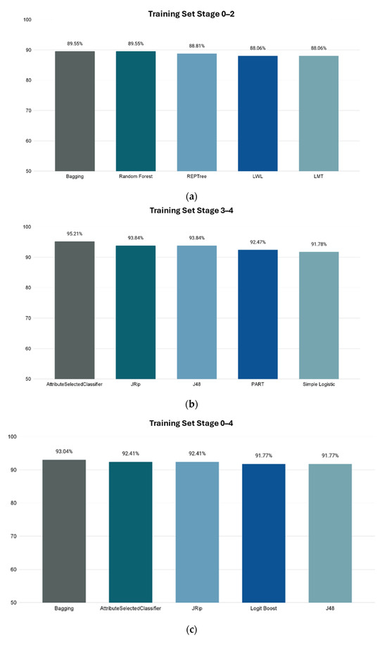 For the three datasets—Stages 0–2, Stages 3–4, and Stages 0–4—different classification methods were tested on each to discover which method yielded the highest accuracy, using WEKA’s classify tool.
