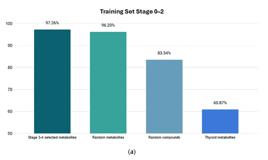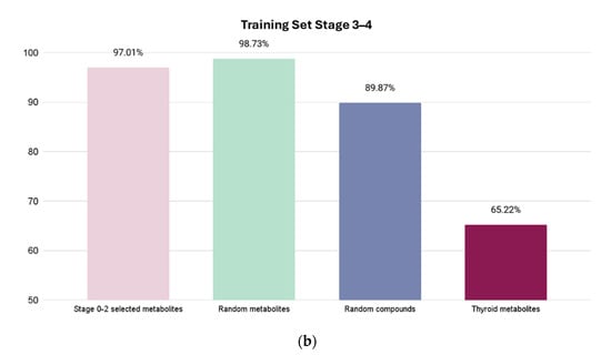 The Stage 0–2 Bagging classifier ML model was tested on 4 sets of data: (1) 146 Stage 3–4 metabolites; (2) 79 random HMDB metabolites; (3) 79 random ZINC compounds; and (4) a set of 23 thyroid cancer metabolites [33]. The resulting accuracies of metabolite class prediction are shown in Figure 4a.