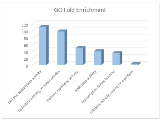 Elucidated genes were analyzed with the Gene-Ontology (GO)-Panther Enrichment module. The results are presented in Figure 5. Note that the top enrichment scores have epigenetic regulation molecular functions. There are several publications that point out that metabolites can cause epigenetic regulation events that can be related to cancer [36,37].