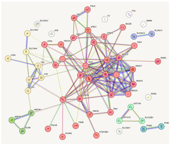 The obtained set of protein targets was submitted to the STRING program, and we obtained a network of protein–protein interactions based on the predicted CRC metabolite gene targets (Figure 6). The obtained protein targets were also analyzed with the DisGeNET program to check their relation to various cancers. The results of this analysis show that 34 from 56 of the predicted gene targets have a known relation to different types of cancers, including CRC (Table 1). We did not expect that we would find only the neoplasms related to CRC, but, considering a lot of common genes involved in different cancers, we obtained a pattern corresponding to the current stage of research, where some of the cancers were explored more in depth than CRC. In general, these results support our assumption that the metabolites found in CRC comprise active agents affecting cancer-related genes. However, this finding needs further study.