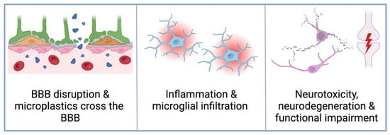 Microplastics circulating in the blood inevitably encounter the BBB, which is susceptible to disruption by environmental pollutants directly and associated chronic inflammation (Figure 2). Shan et al. [93] found that microplastic exposure in an in vitro BBB model downregulated the expression of tight junction proteins zonulin and occludin. This has been reflected in vivo where microplastic exposure increased permeability of the BBB in the hippocampus, hypothalamus, and cortex of mice [78,91,93]. Microplastics of up to 10 μm enter the cortex, hippocampus, and cerebellum of mice in a dose-dependent manner after only 24 h of exposure [78,90,91]. Although this evidence was primarily derived from animal models, microplastic infiltration into brain tissue has also been observed in situ. Microplastics found in the brains of wild estuarine Seabass were mostly fragments smaller than 50 μm, although the largest particle found was 96 μm [98]. No data has been collected to show whether microplastics accumulate in the brains of humans although their presence in the placenta and urine (having crossed endothelial barriers) [10,83,99] indicates this possibility. Brain tissue is highly sensitive to foreign material, so microplastic transport across the BBB poses a significant risk for neuroinflammation and cellular changes in the brain.