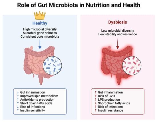 Numerous investigations have highlighted that shifts towards an unfavorable microbial balance are primarily linked to the consumption of a “Western” diet, characterized by high-fat and carbohydrate content. Kumar et al. observed that infants born to mothers with a higher proportion of Firmicutes in their gut exhibited modified DNA methylation patterns compared to infants born to mothers with a higher proportion of Bacteroidetes []. These microbial communities are known to directly impact epigenetic changes through DNA methylation. In addition to dietary influences, other factors, such as antibiotic usage and infections, can also affect the gut microbiota [], leading to imbalances and decreased microbial diversity, a condition referred to as gut dysbiosis. Generally, the first aspect of gut dysbiosis is an unbalanced percentage relationship between the most important Phila, such as Firmicutes and Bacteroidetes. In particular, these two Phila in normal conditions stay in a 1:1 ratio, but when there is a particular dysbiosis, we can observe an unbalanced ratio markedly in favor of Firmicutes, with a decrease in the percentage of Bacteroidetes. During the initial years of life, the microbiome of young children undergoes significant transformations, eventually evolving into a more mature configuration by the age of 3 or 4, at which point the rate of alteration decreases until after adulthood, where the microbiome seems to remain stable for extended periods, potentially throughout the entire lifespan []. Regarding the influence of diet on the gut microbiota, proteins from sources like red meat and dairy products have been shown to increase the population of biliary anaerobes and, notably, boost the abundance of Bacteroides []. Moreover, the fermentation of animal proteins can decrease the levels of Bacteroides and the production of SCFAs, triggering an inflammatory response in the intestines and potentially worsening chronic diseases. Nevertheless, consuming certain animal or plant proteins can have beneficial effects on the gut microbiota by promoting the growth of symbiotic microbiota, such as Bacteroides and Lactobacillus, in the intestines []. Under healthy circumstances, the gut microbiota demonstrates stability, resilience, and a symbiotic relationship with the host. Various intrinsic factors, like intestinal permeability, pH levels, and mucus production, may impact the composition and abundance of microbial communities. Presently, the predominant perspective suggests that a healthy gut microbiota community typically displays high taxonomic diversity, richness in microbial gene, and a consistent core microbiota composition (Figure 2).