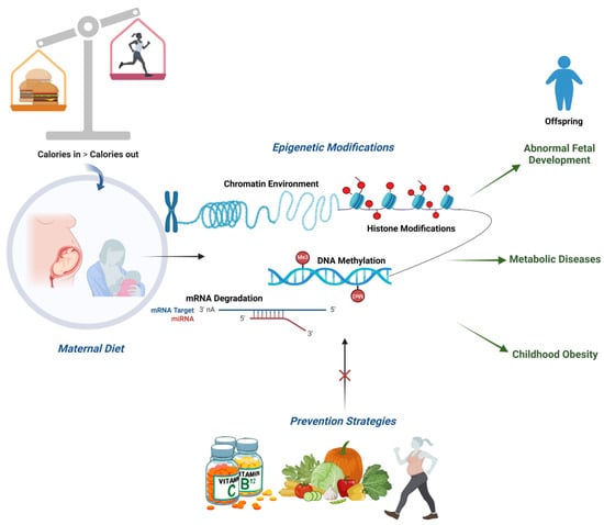 Epigenetics consists of a vast array of heritable biological modifications able to modify gene expression or activity without altering the DNA sequence. The main epigenetic changes are represented by DNA methylation, the expression of non-coding RNAs (ncRNAs), and histone modifications []. Nutrition is considered essential for regulating epigenetic processes []. The human epigenome is highly malleable during fetal and early life development and is vulnerable to environmental influences. As it has been shown in the pancreas of murine models, a low-protein maternal diet during pregnancy may limit the availability of nutrients, leading to alterations in the expression and methylation status of key pancreatic genes, such as Pdx1 and MafA, and to the consequent developmental dysregulation of β-cell activity with long-term health consequences on the offspring []. Hence, maternal dietary habits throughout pregnancy, as well as the early years of life may be a significant impact factor for the offspring’s epigenetic programming. Thus, compromised maternal nutritional choices can result in epigenetic changes able to negatively influence the development of the embryo or even the epigenetic profile of the offspring at birth [].