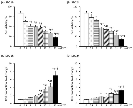 Effects of sodium taurocholate (STC) on cell viability and reactive oxygen species (ROS) production. The viability of AR42J cells exposed to 0–12 mM of STC for 1 (A) and 2 h (B) is presented as a percentage of cells without STC (100%). ROS production by AR42J cells exposed to 0–12 mM of STC for 1 (C) and 2 h (D) is depicted as fold changes relative to cells without STC (0 mM STC). All values are presented as means ± SEM; n = 9 per group. * p < 0.05 vs. 0 mM; # p < 0.05 vs. 0.5 mM; † p < 0.05 vs. 5 mM; ‡ p < 0.05 vs. 10 mM (one-way ANOVA with LSD).