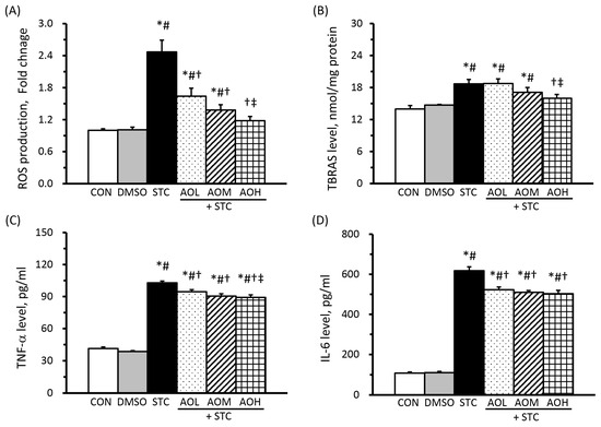 Effects of algal oil on reactive oxygen species (ROS) production (A) and levels of thiobarbituric acid reactive substances (TBARS, (B)), tumor necrosis factor (TNF)-α (C), and interleukin (IL)-6 (D) in sodium taurocholate (STC)-treated cells. AOL + STC, AOM + STC, and AOH + STC groups were pretreated with AO, containing 50, 100, and 150 μM of DHA, respectively. All values are means ± SEM; n = 8 to 12 per group. * p < 0.05 vs. the CON group; # p < 0.05 vs. the DMSO group; † p < 0.05 vs. the STC group; ‡ p < 0.05 vs. the AOL + STC group (one-way ANOVA with LSD).