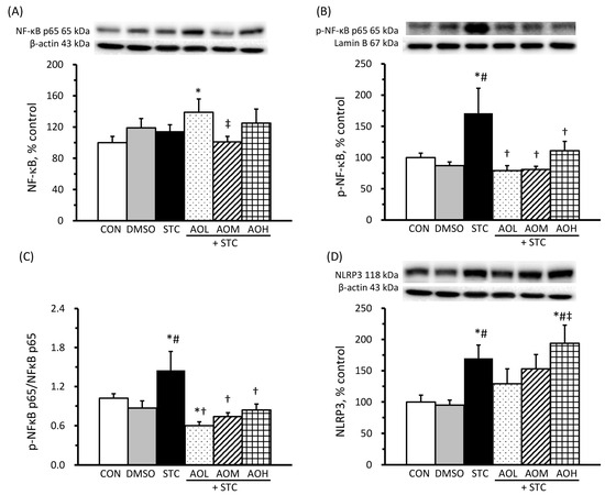 Effects of algal oil on protein levels of cytosolic NF-κB (A) and nucleic p-NF-κB (B), the ratio of nucleic p-NF-κB to cytosolic NF-κB (C), and NRLP-3 (D) in sodium taurocholate (STC)-treated cells. AOL + STC, AOM + STC, and AOH + STC groups were pretreated with AO, containing 50, 100, and 150 μM of DHA, respectively. Protein levels are presented as a percentage of the CON group (100%). The ratio of nucleic p-NF-κB to cytosolic NF-κB is presented as fold changes of the CON group. All values are means ± SEM; n = 8 per group. * p < 0.05 vs. the CON group; # p < 0.05 vs. the DMSO group; † p < 0.05 vs. the STC group; ‡ p < 0.05 vs. the AOL + STC group (one-way ANOVA with LSD).