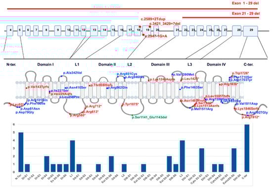Distribution of identified variants along the SCN1A gene’s coding exons (splicing variants, deletions) and Nav1.1 protein (missense, stop, frameshift and in frame). The alpha subunit consists of four homologous domains (D1–D4), each formed of six transmembrane segments (S1–S6). Segment 4 represents the voltage sensor, and S5–S6 represents the pore region. Individual variants are displayed in different colors; truncating variants are marked in red, missense blue and in frame dup in green.