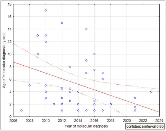 DRVT molecular diagnosis age dispersion chart in years vs. patient age. (mean age 5.283, correlation coefficient −0.375768, p = 0.012).