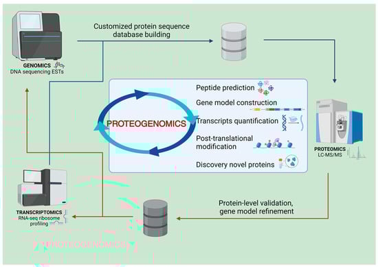 In proteogenomics, a blend of genomic and transcriptomic information is utilized to create custom protein databases, enhancing the interpretation of proteomic data. This method allows for the validation of gene expression at the protein level and aids in refining gene models. Improved gene models, in turn, contribute to the advancement of protein sequence databases used in traditional proteomic analyses. This cyclical process enhances the overall accuracy and efficiency of proteomic research (Created with BioRender.com, accessed on 1 April 2024).