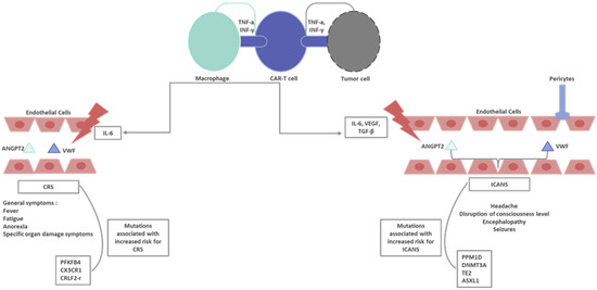 Several markers of endothelial injury have been found to increase in patients with CRS and ICANS. Angiopoietin-II and vWF, as markers of endothelial injury, were found to be elevated in patients with severe ICANS (stage 4) [90]. An increased angiopoietin-II/angiopoietin-I ratio has been observed in those who were diagnosed with severe ICANS (grade ≥ 3) compared to those with grades 0 to 2 [91]. The cytokine production sequence of the CRS results in the activation of vascular inflammation leading to abnormal function of the endothelium [24]. In particular, the EASIX and the modified EASIX (m-EASIX), as markers involved in endothelial injury, have been suggested as potential predictors of severe ICANS and CRS [10,92]. The activation of endothelial cells in the CNS and of pericytes followed by CAR-T immunotherapy leads to the production of interleukin-6 (IL-6), vascular endothelial growth factor (VEGF), and interferon-γ (IFN-γ), increasing the permeability of the blood–brain barrier (BBB) [93,94,95,96]. The increase in these molecules combined with increased levels of tumor necrosis factor-alpha (TNF-a) (secreted by activated CAR-T cells) activates the production of matrix metalloproteinase (MMP) 2 and 9 by CNS endothelial cells [97,98]. MMPs contribute to endothelial damage, activating cell adhesion molecules and further increasing the permeability of the BBB [99].