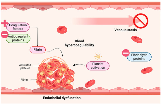 Virchow triad. Venous thrombosis is suggested to be promoted by three important factors: blood hypercoagulability, venous stasis and endothelial dysfunction. Figure created with Biorender.com (accessed on 13 April 2024).