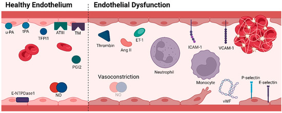 Molecular profile of a healthy endothelium characterized by anti-thrombotic mechanisms (left); Molecular profile of endothelial dysfunction with the display of adhesive, pro-inflammatory, and pro-clotting properties (right). Abbreviations: ATIII, antithrombin III; ET-1, Endothelin-1; E-NTPDase1, ectonucleoside triphosphate diphosphohydrolase-1; ICAM-1, intercellular adhesion molecule-1; NO, nitric oxide; PGI2, prostaglandin I2; TFPI1, tissue factor pathway inhibitor 1; TM, thrombomodulin; tPA, tissue-type plasminogen activator; u-PA, urokinase-type plasminogen activator; VCAM-1, vascular cell adhesion molecule-1; vWF, von Willebrand factor. Figure created with Biorender.com (accessed on 13 April 2024).
