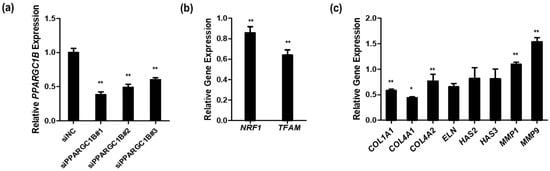 Effects of PPARGC1B knockdown in human dermal fibroblasts. (a) Downregulation of PPARGC1B expression using three siRNAs compared to negative control siRNA (siNC); (b) Expression of NRF1 and TFAM, associated with mitochondrial biogenesis, in PPARGC1B-knockdown cells; (c) Expression of genes associated with human skin extracellular matrix components in PPARGC1B-knockdown cells. Bars indicate standard deviation. ** p < 0.05, * p < 0.1; Student’s t-test.