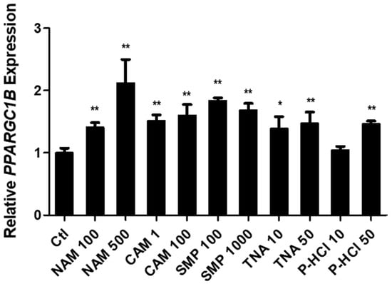 Screening materials with the ability to upregulate PPARGC1B expression. Niacinamide (NAM), camphor (CAM), Agefinity™ (SMP), tranexamic acid (TNA), and pyridoxine HCl (P-HCl) increased the expression of PPARGC1B at the mentioned concentrations. Bars indicate standard deviation. ** p < 0.05, * p < 0.1; Student’s t-test.