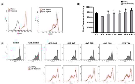 Hs68 cells were seeded into six-well plates at a density of 2 × 105 cells/well and cultured overnight at 37 °C in an atmosphere with 5% CO2. Before treatment with the active materials, cells in the UVB treatment group were exposed to UVB, as mentioned in Section 2.4. Twenty-four hours after the treatment, the cells were trypsinized and washed three times with 1X PBS. For staining, 500 nM of MitoTracker™ Red CMXRos (Thermo Fisher Scientific, Waltham, MA, USA) was added to the wells, and cells were incubated at 37 °C for 30 min in the dark. The unbounded dye was removed with three washes with 1X PBS. Fluorescence signals were analyzed using a CytoFLEX Flow Cytometer (Beckman Coulter, Brea, CA, USA).