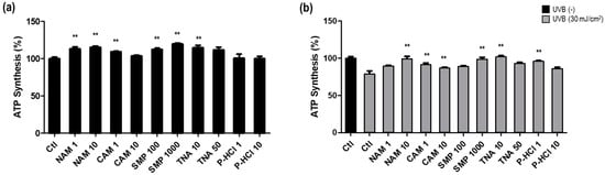 We treated the cells with the five active ingredients at two concentrations each under the following conditions: non-UVB irradiation and 30 mJ/cm2 UVB irradiation. First, we confirmed that ATP production increased significantly by the most active ingredient even in the absence of damage-inducing stress such as UVB irradiation. Upon treatment with 10 μg/mL NAM, 1 μg/mL CAM, 1000 μg/mL SMP, 10 μg/mL TNA, and 1 μg/mL P-HCl, the ATP levels were increased by 15.4%, 9.6%, 19.8%, 14.8%, and 4.2%, respectively, compared with that in the non-treated control (Figure 4a). When cells were damaged by UVB irradiation, the ATP production ability was decreased by 20.9%. The reduced ATP production ability was recovered when the cells were cultured with the five active ingredients after UVB irradiation. Upon treatment with 10 μg/mL NAM, 1 μg/mL CAM, 1000 μg/mL SMP, 10 μg/mL TNA, and 1 μg/mL P-HCl, ATP levels showed recovery by 20.3%, 12.2%, 19.5%, 22.8%, and 17%, respectively, compared with that in the untreated control irradiated with UVB alone (Figure 4b). These results imply that the five active ingredients that regulate PPARGC1B expression promote ATP synthesis and can restore ATP synthesis when mitochondrial damage occurs during skin aging.