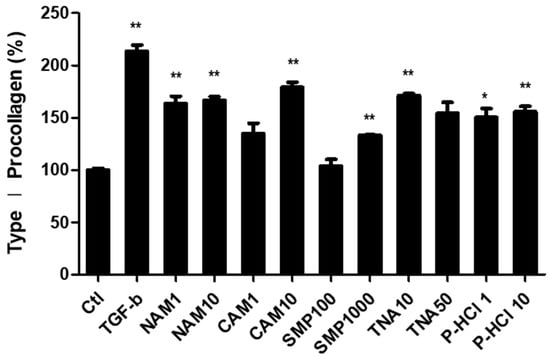 To date, approximately 28 members of the collagen superfamily have been identified [44]. Among them, three types of collagen are primarily present in the adult skin. Type I collagen accounts for 85–90%, type III collagen accounts for 8–11%, and type V collagen accounts for 2–4% of the total collagen [45]. Considering that type I collagen is the main subtype in the human skin, we investigated the effect of the five active materials on promoting type I collagen synthesis by enhancing mitochondrial function through the upregulation of PPARGC1B expression and ΔΨm. The cells were treated with each of the five active ingredients at two concentrations, and all five ingredients significantly promoted collagen synthesis, at least at one of the concentrations used. Treatment with 10 μg/mL NAM, 10 μg/mL CAM, 1000 μg/mL SMN, 50 μg/mL TNA, and 10 μg/mL P-HCl resulted in 62.8%, 74.2%, 33.2%, 64.8%, and 60.8% increases in secreted type I procollagen levels compared with those in the control, respectively (Figure 5). These findings indicate that the five active materials selected in this study are promising candidates for improving wrinkles by enhancing mitochondrial function and promoting collagen synthesis.