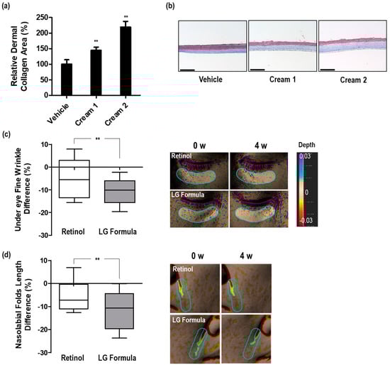 Enhancement of dermal collagen in 3D skin equivalent and facial wrinkle improvement in human subjects by treatment with formulations containing PPARGC1B expression regulating materials. (a) Effect of two cream formulations on increasing dermal collagen area in 3D skin equivalent; (b) representative images of cross sections of 3D skin equivalent; scale bar = 275 μm; (c) comparison of the undereye fine wrinkle improvement rate between 0.1% retinol treated and LG formula treated groups after 4 weeks; (d) comparison of the nasolabial fold length improvement rate between 0.1% retinol treated and LG formula treated groups after 4 weeks. Each representative image was captured using an Antera 3D camera before and 4 weeks after treatment. Bars indicate standard deviation. ** p < 0.05; Student’s t-test.