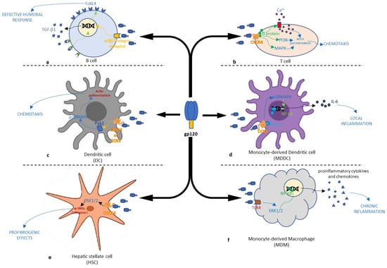 Schematic representation of the signaling pathways involved in the cellular alteration action induced by the HIV-1 gp120 protein: (a) interaction with the integrin receptor on B cells causes a defective humoral response; interaction with CXCR4 on T cells (b) and on dendritic cells (c) causes a chemotaxis increase; interaction with CCR5 on monocyte-derived dendritic cells (d) and on monocyte-derived macrophage (f) increases inflammation; interaction with CXCR4 on hepatic stellate (e) cells causes a profibrogenic effect.