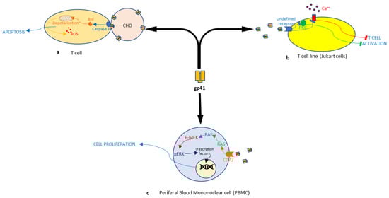 Schematic representation of the signaling pathways involved in the cellular alteration action induced by the HIV-1 gp41 protein: (a) the fusion/hemifusion process mediated by gp41 causes human CD4+ T cells’ apoptosis; (b) interaction with an undefined receptor blocks Jurkat cells’ activation; (c) interaction with CD72 causes peripheral blood mononuclear cells’ proliferation.