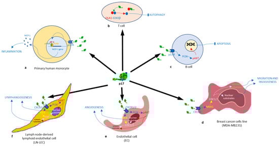 Schematic representation of the signaling pathways involved in the cellular alteration action induced by the HIV-1 p17 protein: (a) interaction with p17 receptor on primary human monocytes increases inflammation; (b) intracellular interaction with OLA1 inhibits T cell autophagy; (c) interaction with p17 receptor inhibits B cells’ apoptosis; (d) interaction with CCR2 increases breast cancer cells’ migration and invasiveness; interaction with CXCR1/2 increases angiogenesis (e) and lymphangiogenesis (f).