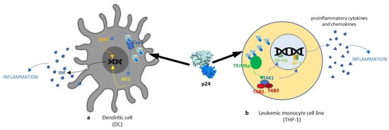 Schematic representation of the signaling pathways involved in the cellular alteration action induced by the HIV-1 p24 protein. Intracellular interaction with cyclophilin A (CypA) in dendritic cells (a) activates both STAT and IRF3 INF induction, increasing inflammation. In a leukemic monocyte cell line (b), interaction between TRIM5α and hexameric p24 stimulates AP-1 and NF-KB signaling via the TAK1/TAB2/TAB3 complex pathway and elicits proinflammatory signaling pathways.