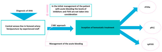 Hemostatic agents that can be used include recombinant FVIIa (rFVIIa), activated prothrombin complex concentrates (aPCCs), and recombinant porcine FVIII (rpFVIII) [23,85]. Data from retrospective and prospective studies support that the clinical efficacy of the three agents in the management of AHA is similar [86,87]. In a systematic review of 32 studies, including 671 patients treated with rFVIIa, it was found that the treatment efficacy was >90% (data from five studies examining treatment response) [88]. As suggested, in the initial treatment with rFVIIa, bolus injections of 90 μg/kg every 2–3 h should be used until hemostasis is achieved [33]. In the study of Mingot-Castellano et al., aPCCs as first-line treatment ended the bleeding in 13 out of 14 (92.9%) AHA patients, while as a second-line treatment, it stopped the bleeding in all the patients reported [89]. aPCCs are also used as a prophylactic agent for bleeding events in patients with acquired hemophilia and inhibitors [90]. In the guidelines of Tiede et al., bolus injections of aPCCs between 50 and 100 U/kg (starting doses) every 8–12 h, up to a maximum of 200 U/kg/day, are recommended [33]. Furthermore, the administration of aPCCs is contradicted in patients with AHA and signs of disseminated intravascular coagulation [33]. When rpFVIII is chosen as the initial treatment, a dose of 200 U/kg, followed by additional doses to sustain the levels of FVIII > 50% through the treatment, is used [33]. Studies are suggesting that, during therapy with rpFVIII, the activity of FVIII should be monitored [33,91]. Furthermore, de novo anti-rpFVIII inhibitors can be developed in these patients, leading to discontinuation of the treatment [92,associated with malignan87]. Treatment response to hemostatic agents should be evaluated clinically, and a treatment switch might be implemented if the chosen hemostatic agent is found to be ineffective [93]. Initial treatment with human FVIII should be limited only to cases when access to the above three agents is not available and in patients with low-titer inhibitors (<5 BU) [33]. Plasma-deprived FVIIa/FX has been also evaluated in patients with AHA, with favorable outcomes without an increase in the thrombotic risk [94]. Emicizumab, a monoclonal antibody restoring the function of missing FVIII by connecting FIXa and FX, has been used off-label in AHA [95,96,97,98,99]. Figure 2 presents the initial clinical administration of the patient with AHA in the emergency room department.