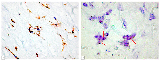 Briefly, to prepare FFPE specimens for the RNAscope procedure, the tissues were fixed and permeable to give the hybridization sample access to the cellular epitope being studied. The two-hour hybridization phase performed at 40 °C was followed by multistep signal amplification performed by the sequential application of reagents, followed by the visualization of RNA as brown point signals visualized by the application of diaminobenzidine.