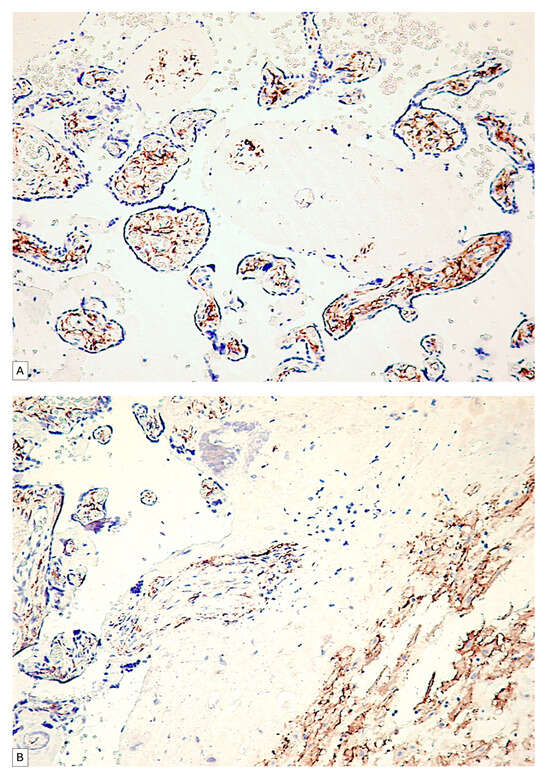 PDPN expression in free placental villi (A) and anchoring placental villi (B). Note the high density of PDPN-positive cells at the level of free placental villi compared to the anchoring villi, where a decrease in the density of PDPN-positive cells in the center of the placental villi can be observed.