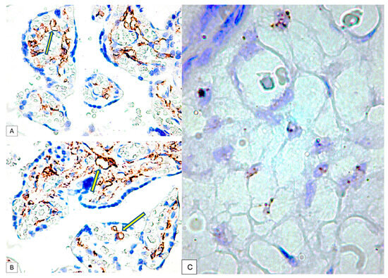 Blood vessels in the chorion of the placental villi were negative for PDPN, while several PDPN+ cells have heterogeneous patterns arrangements observed predominantly in the tertiary placental villi (Figure 5A,B).