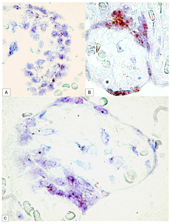 This variability was observed between the placental villi but also in the trophoblast that delimits the same placental villi, where at the level of the placental knots, the RNAscope signal was organized as clusters, while in the resting trophoblast, two to four dotted distinct signals were observed (Figure 6C).