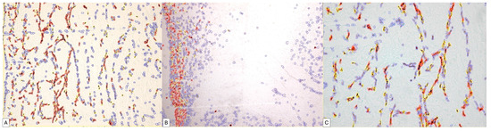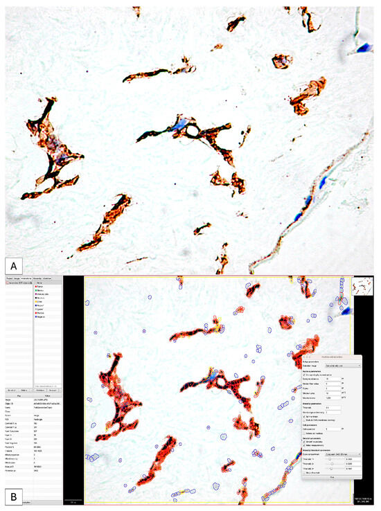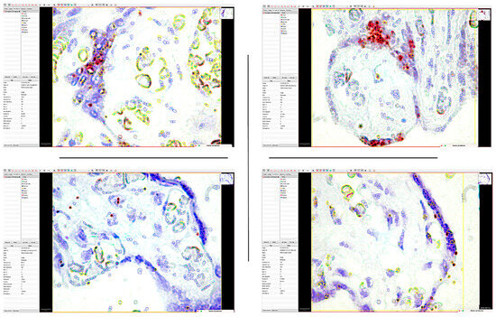 IHC-stained slides were scanned using a Grundium OCUS 20 microscope (Grundium, Tampere, Finland) and stored in the Case Center Slide Library as svs. files (3DHistech, Budapest, Hungary). A project was created by importing all the D2-40-colored slides to Qu Path Image Analysis System version 0.4.3 [19], an open-source platform for microscopic slide bioimage analysis, where they were examined using integrated software and additional programs. In short, we selected three to five regions of interest (ROIs) from the tumor stroma using the instruments in the toolbar that gave us the most accurate delimitation of placental and umbilical cord areas that contained PDPN+ cells. The analysis then proceeded with the detection of the cell by choosing a positive cell detection option and setting cell parameters and intensity parameters. The detection image was set for a sum of optical density with a requested pixel size of 0.5 μm and a cell expansion of 1.988 μm, excluding the nucleus. The intensity threshold parameters comprised the overall score and the three threshold levels assessed as low (+1, highlighted in yellow), moderate (+2, highlighted in orange) and high (+3, highlighted in red), with all cells selected in blue considered negative. During the automatic score assessment, the Qu Path software version 0.4.3 offered us the number of cells, the density score and the intensity score separately and also a combined stromal score (SS, like the Allred score, combining the intensity and density of detected PDPN+ cells and PDPN_mRNA brown-stained dots). Also, an H score was included in the final assessment performed by Qu Path analysis, representing the histological score.