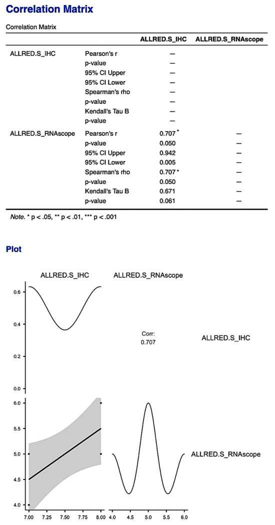The correlation matrix and correlation diagram between the Allred score obtained from immunohistochemical evaluation and the score obtained from RNAscope evaluation. It is worth noting the statistically significant correlation between the two scores, with the support of the existence and expression of PDPN in the human placenta and umbilical cord.