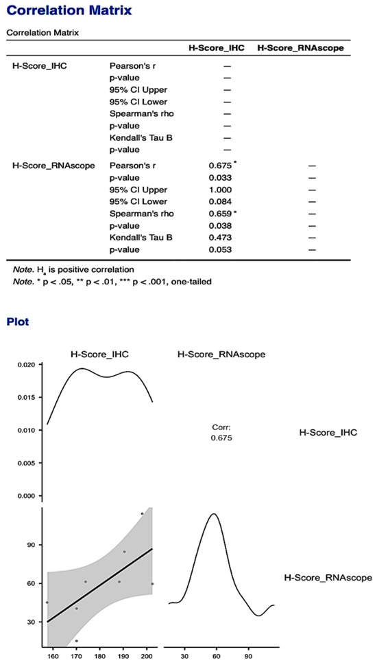 Statistical analysis was performed automatically by exporting the data from the Qu Path system to the Jamovi statistical analysis system. We applied statistical tests to check if protein expression and mRNA expression are significantly correlated. A p-value less than 0.05 was considered statistically significant, while a p value less than 0.001 was interpreted as strongly significant.