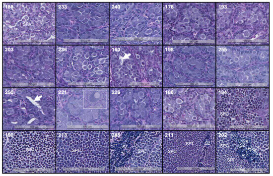 Histology of the testis. In fish 188–180, spermatogonia A (SPA) predominate in compact germinal compartments. Fish 160 and 250 exhibit tubules within the germinal compartment (highlighted by arrows). The small insert in 221 displays oocyte in the testis. Fish 190–202 show more advanced cell stages characterized by a reduction in nucleus diameter and darker staining of the nucleus due to condensed genetic material; spermatocytes (SPC), spermatids (SPT), and spermatozoa (SPZ) are indicated. The scale bar shown in the images indicates size. Fish are organized by ascending GSI. Sample identity, denoted by the number in the upper left corner, corresponds to Table 1. The samples were qualified as in Skjold et al. [25]. Tissue sections were stained with alcian blue and periodic acid Schiff.