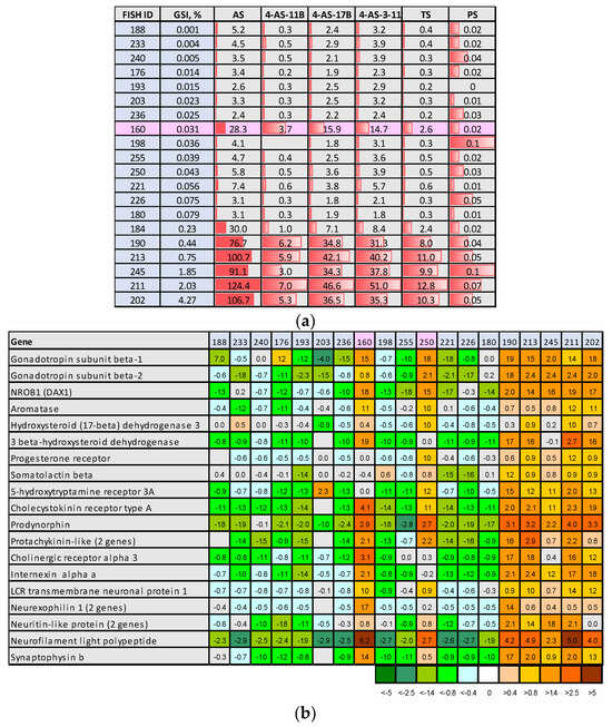 Endocrine and neural changes associated with growth of testis: (a) serum sex steroids (nmol/L) (AS—androstenedione; 4-AS-11B—4-Androsten-11B-OL3-17-dione; 4-AS-17B—4-Androsten-17B-OL3-11B-dione; 4-AS-3-11—4-Androsten-3-11-17-trione; TS—testosterone; PS—progesterone); (b) pituitary gene expression (microarray) (fish ID are the same as in panel (a)). Data are log2-ER centered to the average in all samples.