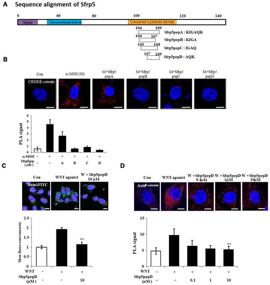 Identification of a Wnt antagonist peptide. (A) Illustrative depiction of WNT antagonist peptide variants. (B,D) B16F1 cells were exposed to α-MSH or Sfrp5 peptides at 1 μM for 12 h. Following fixation, in situ PLA was conducted for CREB/β-catenin and Axin-1/β-catenin using specific antibodies. Nuclei were counterstained with DAPI (blue). Red spots indicate physical interactions between the two specified molecules. (C) Immunostaining of β-catenin in B16F1 melanoma cells using a 60× objective. Treatment with Wnt agonist for 3 h stabilized β-catenin protein in the presence or absence of Sfrp5pepD. Significant differences were found when comparing with WNT agonist-treated control: ** p < 0.01. Scale bar = 10 μm.