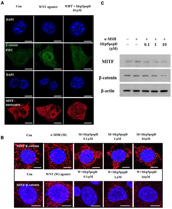 The Wnt/β-catenin signaling stabilizes the interaction between MITF and β-catenin [,,]. Wnt can indeed regulate MITF at the protein degradation level, irrespective of its transcription []. Our findings indicate that Sfrp5pepD disrupts the Wnt/β-catenin signaling pathway by reducing the nuclear localization and interaction between MITF and β-catenin. An inhibitor of the canonical Wnt/β-catenin signaling pathway is accountable for suppressing melanocyte pigmentation by downregulating β-catenin and MITF expression [].