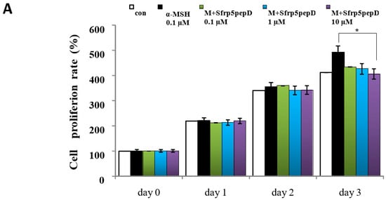 To determine whether Sfrp5pepD affects cell proliferation, we performed CCK-8 assay on B16 melanoma cells treated with α-MSH or SFRP5pepD for 3 days (Figure 3A). Sfrp5pepD was found to inhibit the α-MSH-induced proliferation of B16F1 melanoma cells. We subsequently examined the melanin content and TYR activity to investigate how Sfrp5pepD affects melanogenesis (Figure 3B,C). Our findings indicated that α-MSH treatment increases the melanin contents in B16 melanoma cells, while Sfrp5pepD dose-dependently inhibits the α-MSH-induced melanin contents. The TYR activity using L-DOPA staining was also significantly reduced by SFRP5pepD.