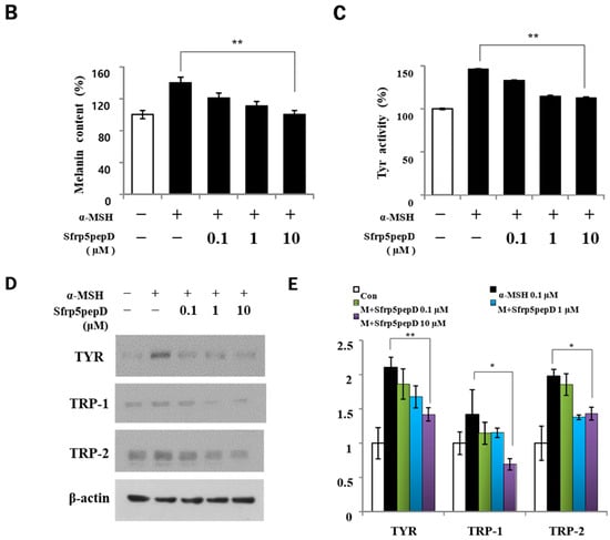 Sfrp5pepD inhibits melanin synthesis in B16F1 melanoma cells. (A) B16F1 cells were treated with 0.1, 1, 10 μM of Sfrp5pepD in conjunction with α-MSH (100 nM) for 3 days. The cellular growth rate of each sample was determined using the CCK-8. Significant differences were found when comparing with α-MSH-treated control: * p < 0.05. (B) The melanin content and (C) tyrosinase activity were determined by measuring the absorbance at 490 nm. B16 melanoma cells were treated with 0.1, 1, 10 μM of Sfrp5pepD in conjunction with 100 nM α-MSH for 48 h. The values indicate the mean of three independent experiments. Significant differences were found when comparing with α-MSH-treated control: ** p < 0.01. (D) The expression of TYR, TRP-1, TRP-2 mRNA was investigated via a real-time PCR analysis. The values indicate the mean of five independent experiments. (E) The protein expressions of the melanogenesis-associated enzymes, TYR, TRP-1, and TRP-2 were examined using Western blot analysis. Significant differences were found when comparing with α-MSH-treated control: * p < 0.05, ** p < 0.01.