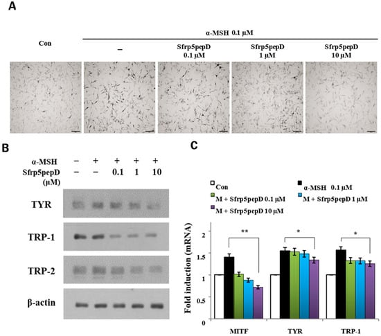 SFRP5pepD decreases melanogenesis in normal human melanocytes. (A) In situ tyrosinase activity was determined by the incubation of cells in L-DOPA, following 24-h treatment with 0.1, 1, and 10 μM of Sfrp5pepD. Each image was captured under identical conditions using bright field microscopy (bar = 100 µm). (B) Normal human melanocytes were stimulated with α-MSH and 0.1, 1, 10 μM Sfrp5pepD and incubated for 5 days. The expression levels of TYR, TRP-1, and TRP-2 protein were confirmed by Western blot at 5 days. (C) Normal human melanocytes were stimulated with α-MSH and 0.1, 1, 10 μM Sfrp5pepD and were incubated for 48 h. The ex-pression of TYR, TRP-1, and TRP-2 mRNA were investigated via a real-time PCR analysis. The values indicate the mean of three independent experiments. Significant differences were found when comparing with α-MSH-treated control: * p < 0.05, ** p < 0.01.