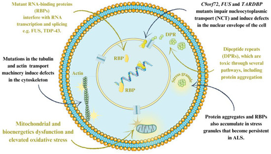 The formation of mutant RNA-binding proteins (RBPs; e.g., fused in sarcoma (FUS) and transactive response DNA binding protein 43 kDa (TDP-43)) interferes with RNA metabolism, resulting in extensive changes in transcription and splicing [13]. The C9orf72, FUS, and TARDBP mutants impair nucleocytoplasmic transport (NCT) and induce defects in the nuclear envelope of the cell [23]. The C9orf72 gene is associated with frontotemporal dementia and/or ALS, with 50% of patients developing symptoms before the age of 58 years [24]. Dipeptide repeats (DPRs) are toxic due to the formation of protein aggregates, chromatin lesions and DNA damage [13].