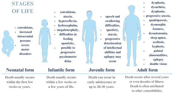 Symptoms of the disease vary depending on the age at which they occur (neonatal, infantile, juvenile, or adult), and may vary in severity as well. These symptoms are shown in Figure 2 [43,44].