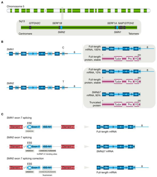 Molecular mechanisms of spinal muscular atrophy development. Wild-type chromosome 5q13 is covered by the telomeric SMN1 gene and the centromeric SMN2 gene (A); splicing pre-mRNA SMN1 produces full-length mRNA (B); exon 7 splicing in SMN1 and SMN2 genes (C). Reprinted with permission from Ref. [87]. Copyright 2022 MDPI.