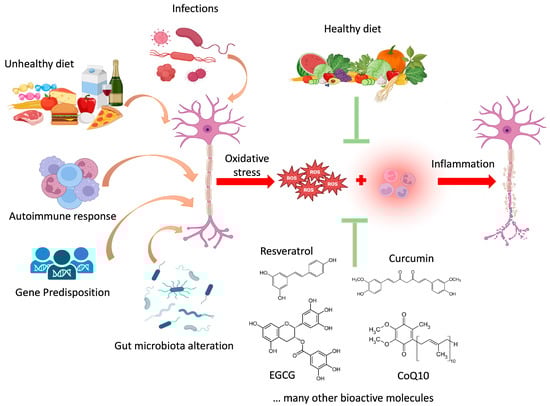 Schematic representation of the factors contributing (orange arrows) to oxidative stress and inflammation, the causes (red arrows) of axonal demyelination in MS, and the corrective factors (bioactive substances and a healthy diet) that could reduce (green arrows) the impact of the triggering factors. ROS: Reactive Oxygen Species; EGCG: Epigallocatechin gallate; CoQ10: Coenzyme Q10.