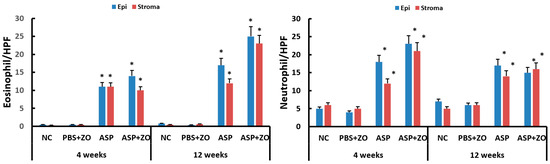 The tissues were fixed with 10% formalin solution and embedded in paraffin for sectioning at 5 μm intervals. Inflammatory cell infiltration and epithelial thickness were quantified in hematoxylin and eosin (H&E) stained sections. Eosinophil and neutrophil infiltration were calculated as the average number of cells in five high-power fields. Goblet cell hyperplasia was determined by periodic acid-Schiff (PAS) staining, and the average number of goblet cells was counted at ×200 magnification. Epithelial and subepithelial thickness was directly measured at ×400 magnification through a video camera (Olympus Optical Co., Ltd., Tokyo, Japan) and analyzed using the DP Controller software (ver. 2.2.1.227). All tissue sections were blindly examined in terms of tissue origin, and the mean counts were determined at five different mucosal areas.