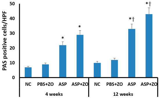A total of 28 rabbits were used for this study. Rabbits were divided into 4 different experimental groups. In group 1 (n = 6 sides each for 4 and 12 weeks), the negative control group in which rabbits were treated with intramaxillary PBS. Group 2 consisted of 8 sides each with intramaxillary PBS inoculation with ZO. Group 3 consisted of 8 sides each with intramaxillary inoculation A. fumigatus without ZO. Group 4 consisted of 8 sides each with intramaxillary A. fumigatus inoculation with ZO. Briefly, the animals were anesthetized with intramuscular injection of 17.5 mg/kg of Zoletil® and 3.5 mg/kg of Rompun®. The nasal dorsum was prepared aseptically followed by local infiltration of lidocaine 2% with epinephrine 1:100,000. To expose the anterior wall of the maxillary sinus, the skin and subcutaneous tissues were dissected. The anterior wall of the maxillary sinus was drilled out (1.5 cm × 3.5 cm) without mucoperiosteal injury. The periosteal flap and skin were sutured using vicryl 4-0 and black nylon 4-0, respectively. PBS or 106/100 μL of A. fumigatus conidia, and 5 mg/100 μL of ZO were inoculated into the maxillary sinus 3 times per week as needed. After 4 and 12 weeks, twenty-four hours after the last sinus inoculation, rabbits were euthanized with 100 mg/kg of thiopental sodium preceded by intramuscular sedation with Zoletil® and Rompun®. After drilling out of the anterior wall of the maxillary sinus, sinus mucosa was collected for further study.