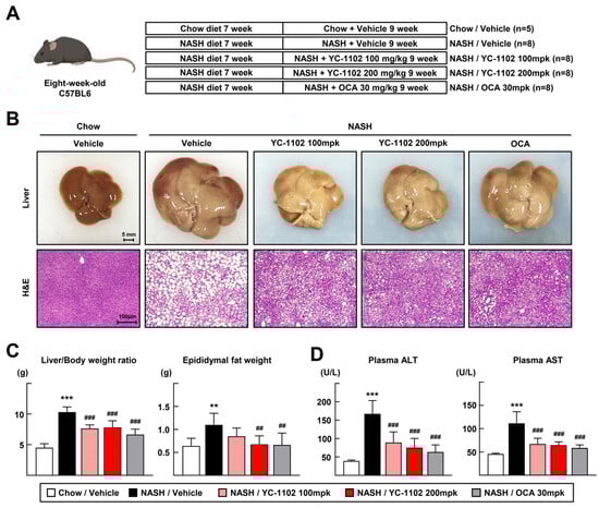 Eight-week-old C57BL/6 male mice (n = 37) were obtained from Orient Bio Inc. (Seongnam, Republic of Korea). The mice were divided into two experimental groups: a chow diet group (n = 5) and a NASH diet group (n = 32), fed a fructose, palmitate, and cholesterol (FPC)-containing diet (Envigo, Huntingdon, UK) with sugar water (23.1 g fructose + 18.9 g glucose in 1 L of autoclaved tap water) [19]. The mice were fed these diets for 16 weeks. After feeding the mice with the FPC diet for 7 weeks (n = 32), the diet was supplemented with a vehicle (n = 8), 100 mg/kg of YC-1102 (n = 8), 200 mg/kg of YC-1102 (n = 8), or 30 mg/kg of obeticholic acid (OCA) (n = 8), which was administered via daily oral gavage for 9 weeks. According to a recent report, oral administration of YC-1102 at doses of 100, 150, and 200 mg/kg for 8 weeks inhibits adipogenesis and adipocyte differentiation in obese mice induced by a high-fat diet [17]. Based on these findings, the dose for this study was determined. YC-1102 was diluted in sterile phosphate-buffered saline (PBS) and OCA (MedChemExpress, Monmouth Junction, NJ, USA) was diluted in 0.5% carboxymethyl cellulose with 0.01% Tween-80 in distilled water. CO2 euthanasia was conducted on the mice to obtain blood from the inferior vena cava and tissues with careful checks for signs of mouse stress following animal guidelines using the gradual fill method. After abdominal laparotomy, the epididymal fat and liver tissues were isolated and fixed in 4% paraformaldehyde and stored at −80 °C. The left lobe of the liver was used for mRNA analysis and hepatic TG measurement. All the experiments were performed in a blinded and randomized fashion according to the guidelines of the Animal Care and Use Committee of Kangwon National University (KW-IACUC-220412-6 and KW-IACUC-210923-1).