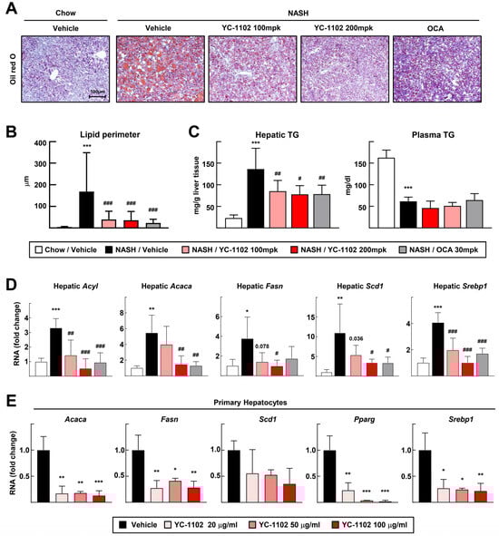 YC-1102 reduces hepatic lipid accumulation via transcriptional downregulation of genes involved in de novo lipogenesis. (A) Representative images of Oil red O staining for sectioned livers. (B) Lipid perimeters in Oil red O staining were measured. (C) Hepatic and plasma TG levels were measured. n = 5 for chow and n = 8 for NASH. (D) Hepatic mRNA transcriptions of Acyl, Acaca, Fasn, Scd1, and Srebp1 were analyzed using qRT-PCR. n = 5 for each group. * p < 0.05, ** p < 0.01, and *** p < 0.001 vs. chow with vehicle; # p < 0.05, ## p < 0.01 and ### p < 0.001 vs. NASH with vehicle. (E) Primary hepatocytes were treated with YC-1102 after oleic acid-incubated lipid accumulation. mRNA transcriptions of Acaca, Fasn, Scd1, Pparg, and Srebp1 in primary hepatocytes were analyzed using qRT-PCR. n = 3 for each group. * p < 0.05, ** p < 0.01, and *** p < 0.001 vs. vehicle. The data represent mean ± SD. Statistical analyses were performed using one-way ANOVA with Bonferroni’s post hoc test.