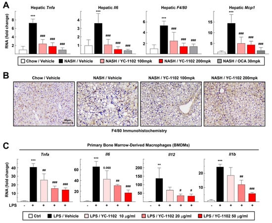 Anti-inflammatory effects of YC-1102 via direct suppression of macrophages. (A) Hepatic mRNA transcriptions of Tnfa, Il6, F4/80, and Mcp1 were analyzed using qRT-PCR. n = 5 for each group. *** p < 0.001 vs. chow with vehicle; ### p < 0.001 vs. NASH with vehicle. (B) Representative images of immunohistochemical staining of F4/80 for sectioned livers. (C) Primary BMDMs were stimulated with LPS after YC-1102 treatment. mRNA transcriptions of Tnfa, Il6, Il12, and Il1b in primary BMDMs were analyzed using qRT-PCR. n = 3 for each group. ** p < 0.01 and *** p < 0.001 versus Ctrl; # p < 0.05, ## p < 0.01, and ### p < 0.001 vs. LPS with vehicle. The data represent mean ± SD. Statistical analyses were performed using one-way ANOVA with Bonferroni’s post hoc test.